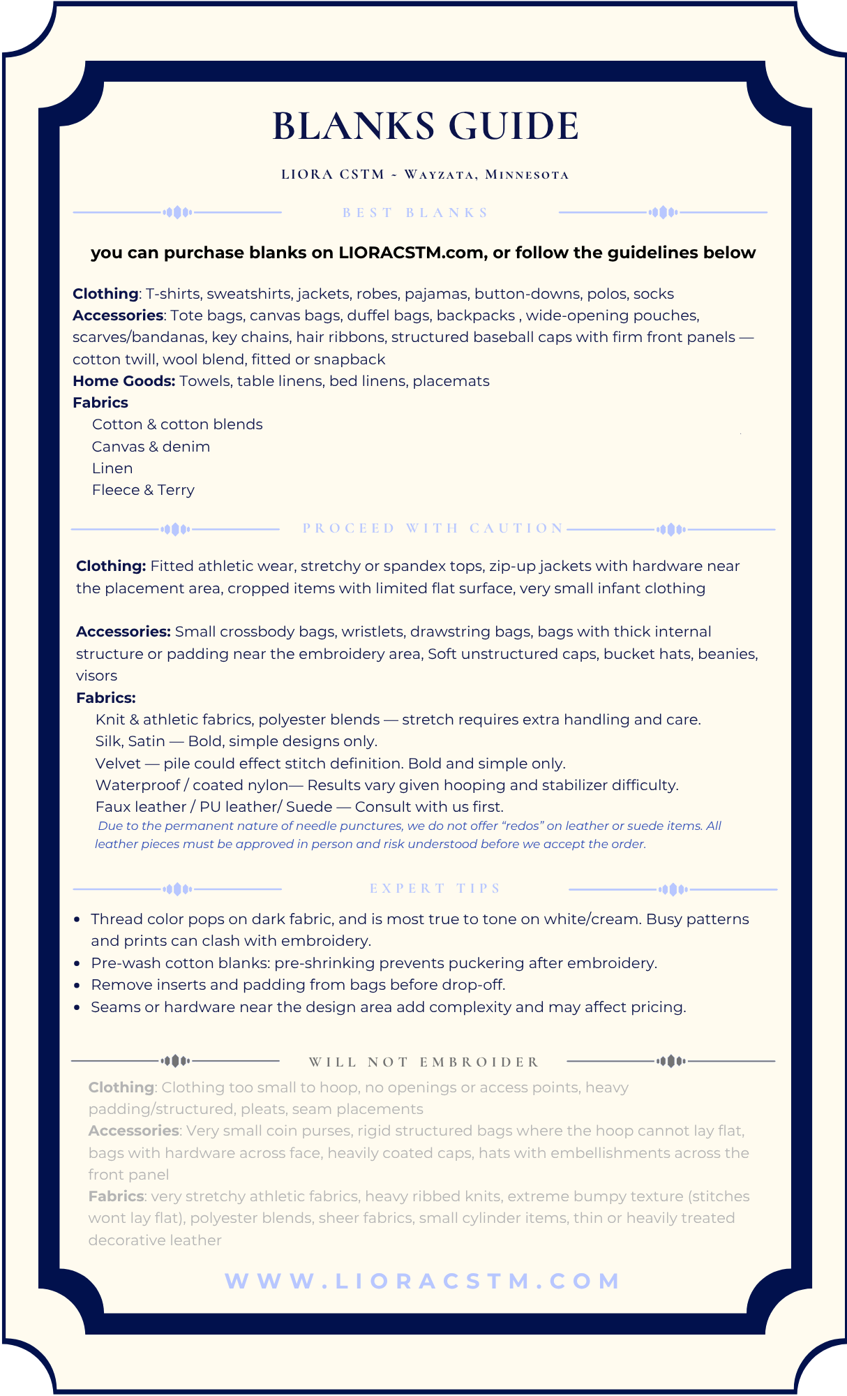We’re able to customize any item that meets the outlined guidelines. For the best results, we recommend selecting from our curated selection, or shopping directly through our Amazon storefront.